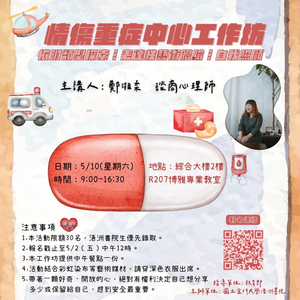 類別:博雅暨藝文活動 講座主題:情傷重症中心工作坊 (含彩虹染布體驗) 講 師:鄭湘柔諮商心理師