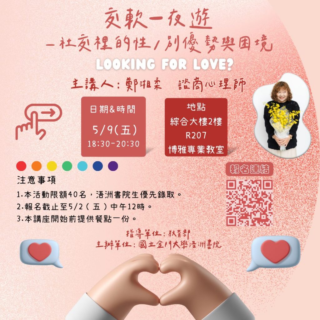 類別:主題式講座 講座主題:交軟一夜遊-社交裡的性/別優勢與困境 講 師:鄭湘柔諮商心理師