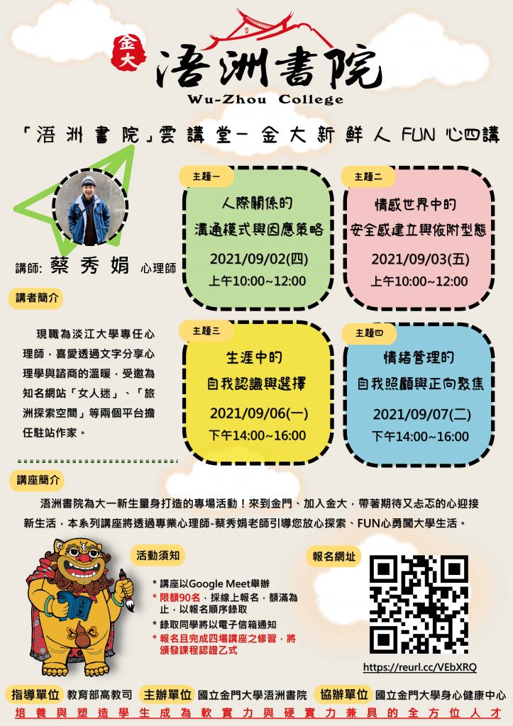 浯洲書院為大一新生量身打造的專場活動:「浯洲書院」雲講堂—金大新鮮人FUN心四講。 來到金門、加入金