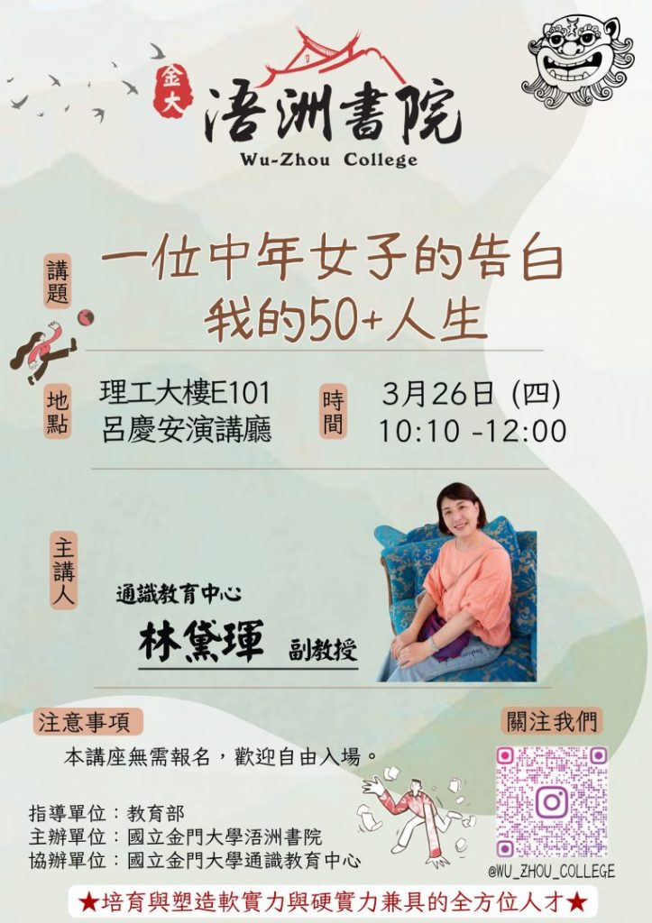 最新消息 / 2026-03-18 〔講座資訊〕3/26一位中年女子的告白—我的50+人生 時間:2026年3月26日(四) 上午10時10分至12時地點:理工大樓E101呂慶安演講廳 講者:林黛琿副教授講題:一位中年女子的告白—我的50+人生 ☆本場次無需報名,歡迎直接入場☆